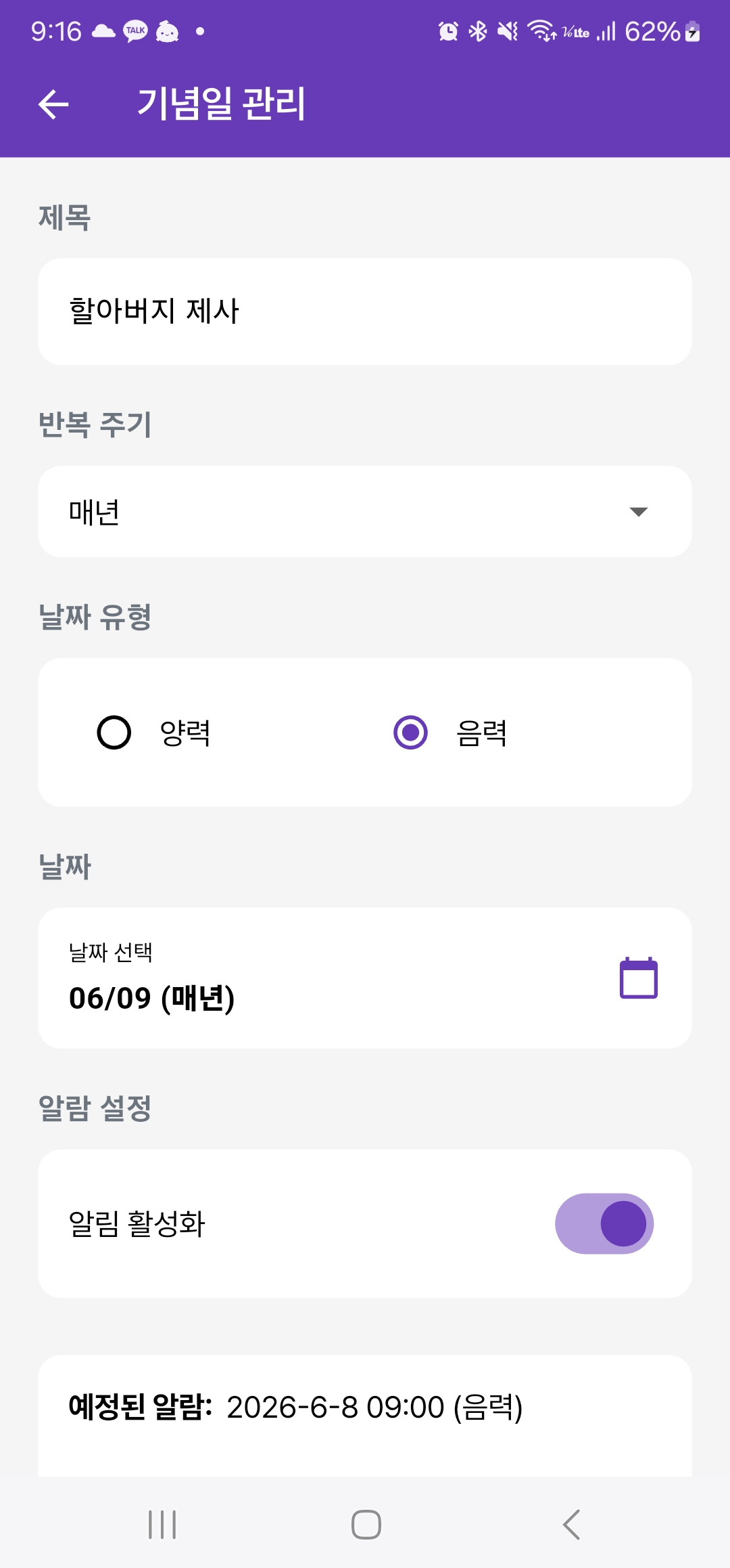 특히 기념일 관리와 음력 알림 기능 덕분에 가족 행사나 중요한 날을 놓치지 않게 된 게 가장 큰 변화였습니다.