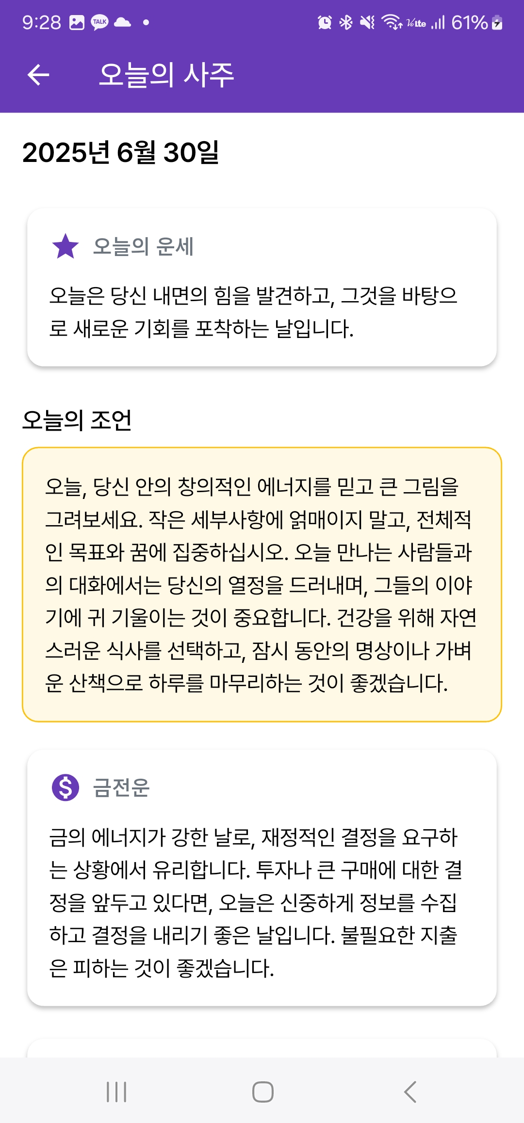 호기심에 써봤는데 오행 분석을 바탕으로 한 오늘의 운세가 꽤 재미있었어요.