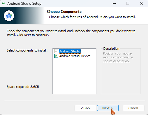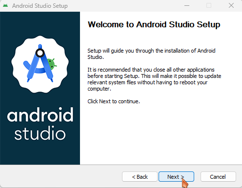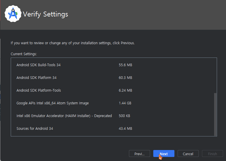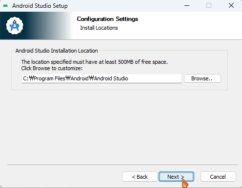 다운로드한 안드로이드 스튜디오 설치 파일을 실행하여 기본 변경 없이 설치를 진행합니다.