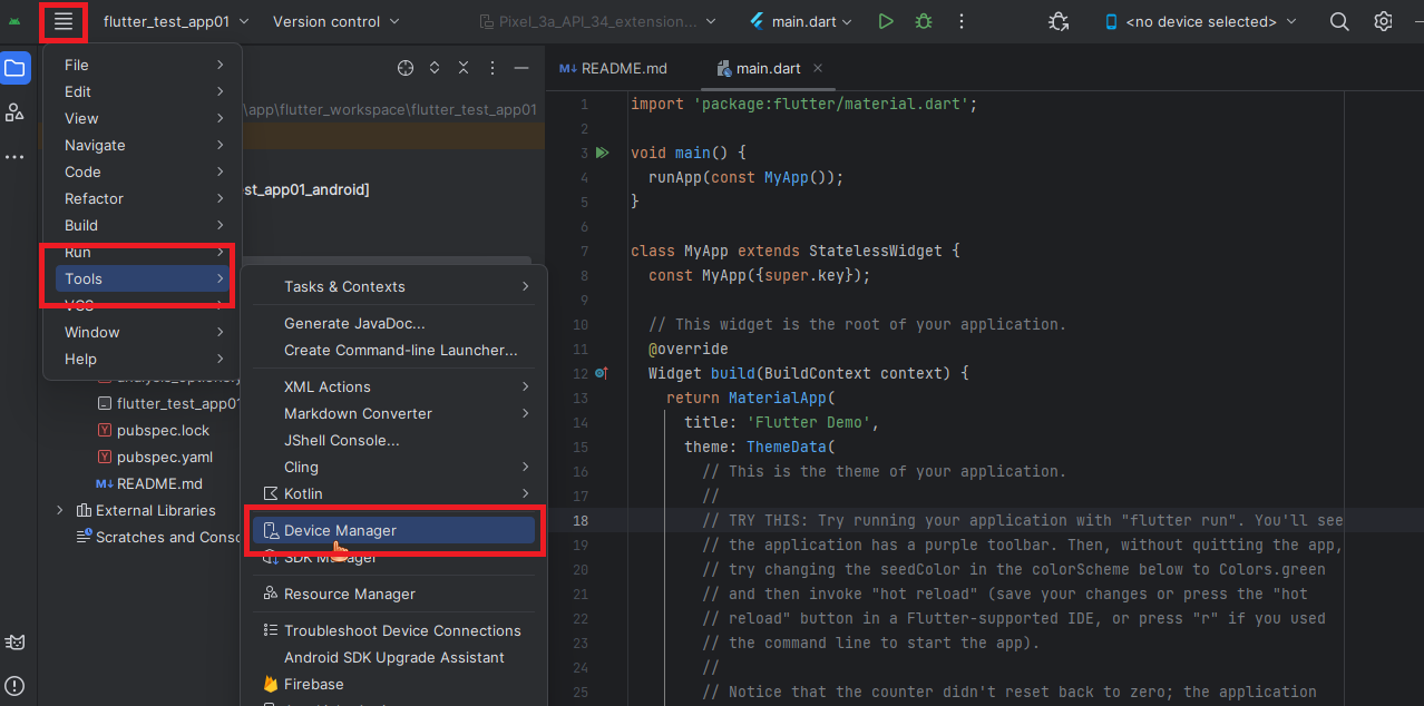 ADV가 실행된 것을 확인 후 2에서 생성한 flutter 프로젝트를 실행하여 ADV에 앱을 띄워봅니다.