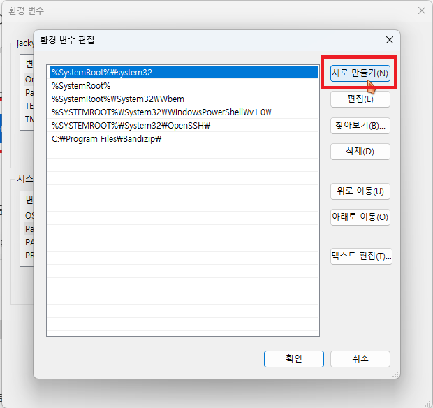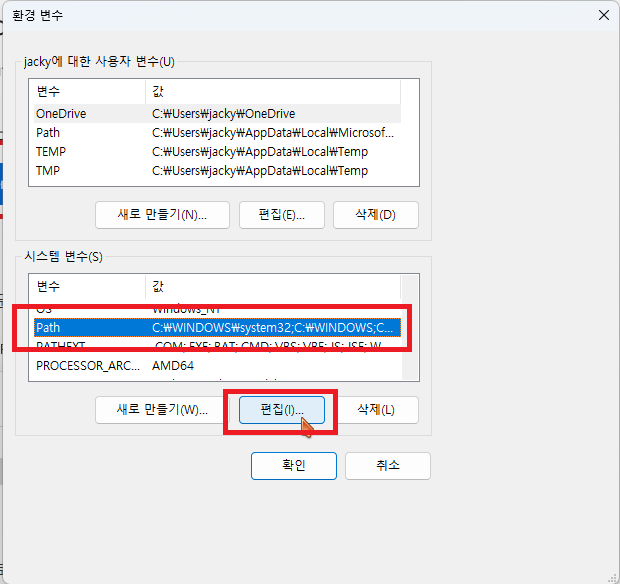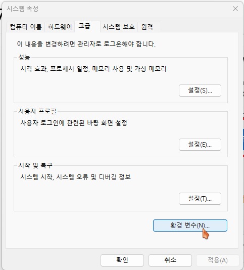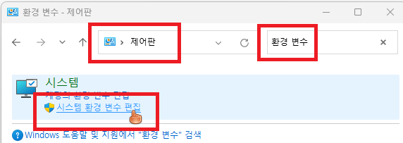 제어판에 들어가 환경 변수를 검색하여 시스템 환경변수 편집으로 들어갑니다