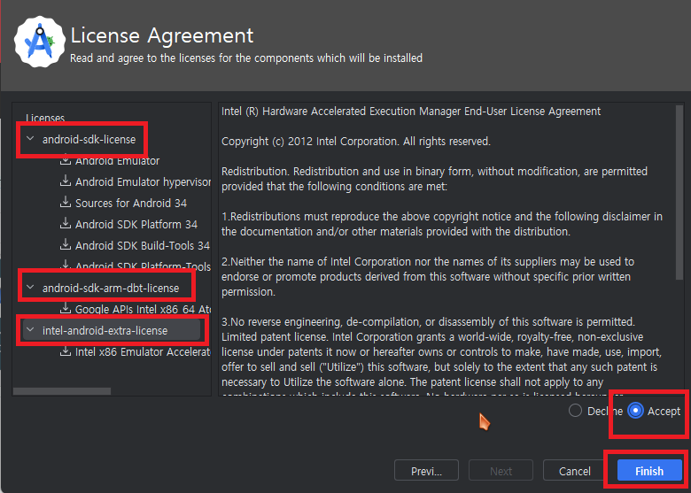 | Next | Next | Next | 설치에 필요한 각 라이센스에 동의후 Finish |