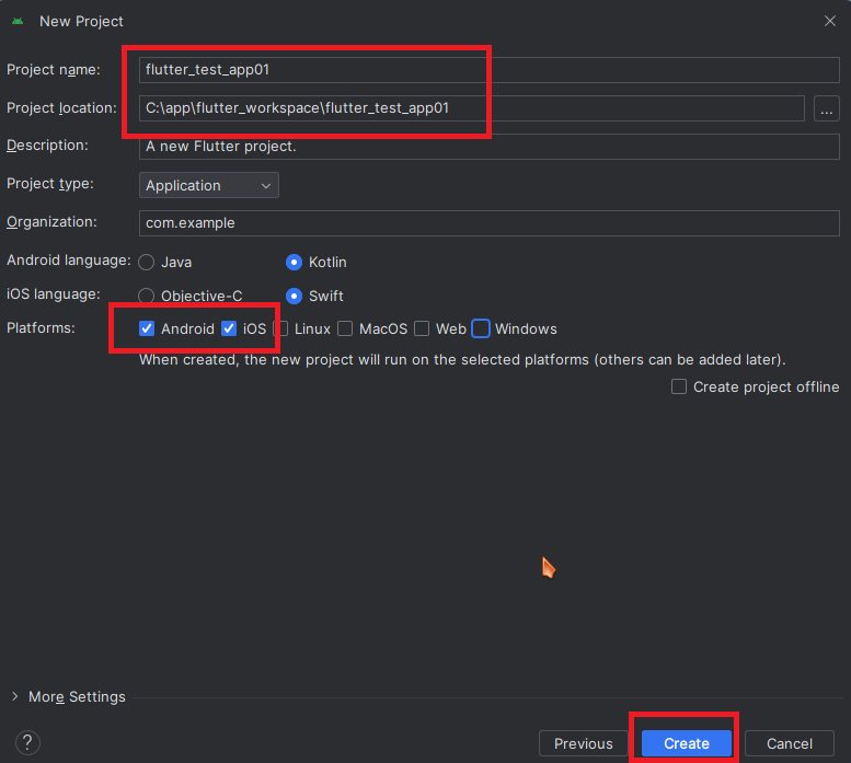 그리고 빌드할 플랫폼을 선택 후 Create 버튼을 눌러 프로젝트를 생성해 줍니다.