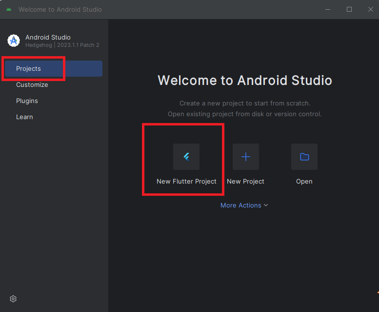 안드로이드 스튜디오가 재실행되면 플러터 프로젝트를 생성할 수 있는 메뉴가 나타납니다.