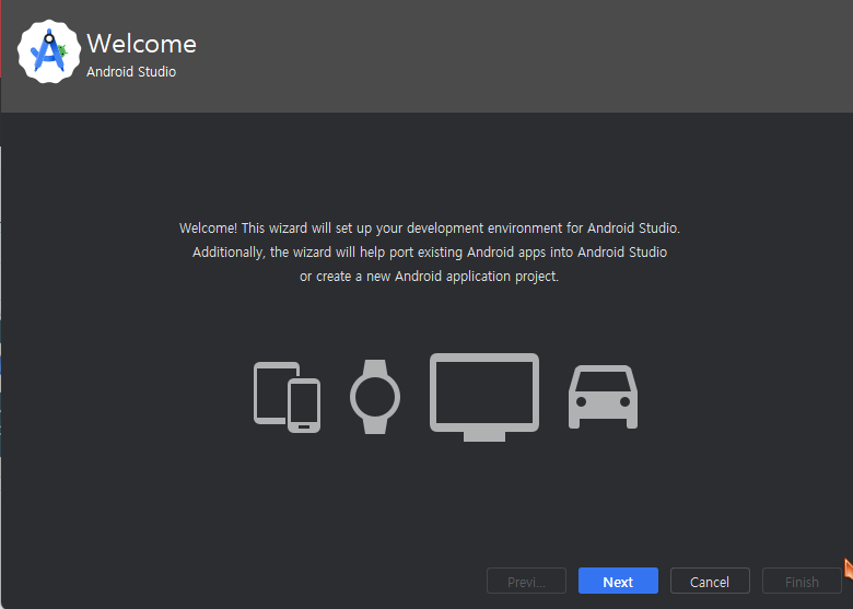 안드로이드 스튜디오를 처음 실행하면 실행에 필요한 파일이 설치될 수 있도록 진행해 줍니다.