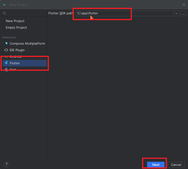 flutter를 선택한 후 flutter가 설치된 경로를 지정해 줍니다.