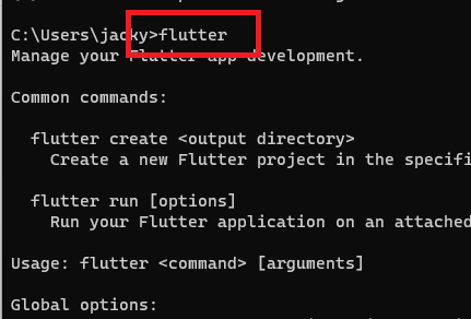 커맨드창에서 명령어를 입력하여, 플러터가에 환경변수가 정상적으로 적용되었는지 확인합니다.