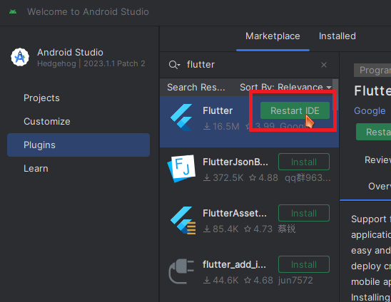 | Plugins 탭 선택후 flutter를 검색후 install버튼 클릭 | Dart 플로그인 설치 요구시 install 버튼 클릭 | Restart IDE를 클릭하여 스튜디오 재실행 |
