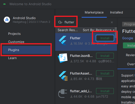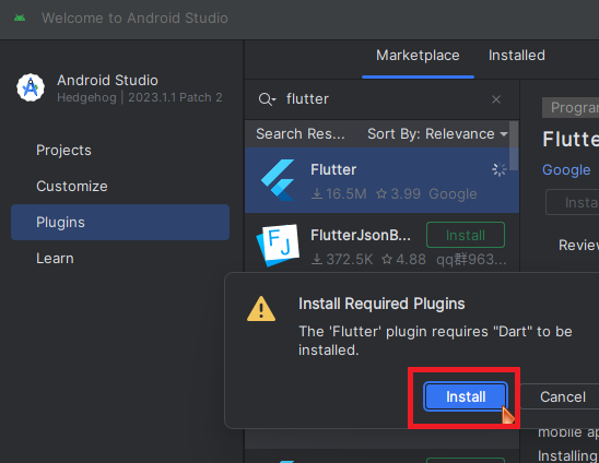 안드로이드 스튜디오의 Plugins 탭에서 flutter를 검색하여 flutter 플러그인을 설치해 줍니다.