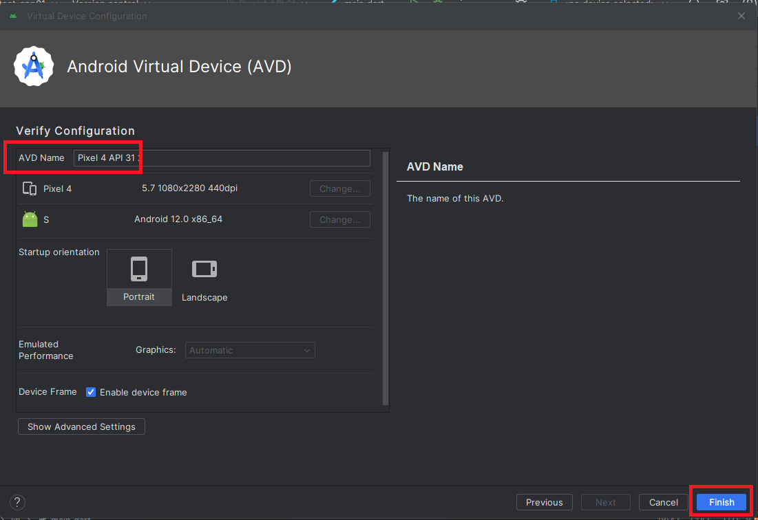 ADV 명을 입력하고 Finish 버튼을 클릭하여 가상디바이스 생성을 완료합니다.