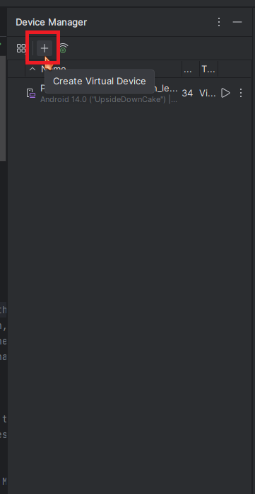 디바이스 매니저 창에 Plus버튼( + )을 클릭하여 가상 머신 생성창을 엽니다.