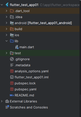 1) 주요폴더 android : 안드로이드 프로젝트 관련 파일로써 플러터를 컴파일하여 생성된 안드로이드 네이티브 코드들이 생성되는 위치 ios : Ios 프로젝트 관련 파일로써 플러터를 컴파일하여 생성된 iOS 네이티브 코드들이 생성되는 위치( 맥전용) lib : 플러터 앱 개발을 위한 다트 소스 코드가 위치한 폴더 (프로젝트 생성시 main.dart 파일이 생성되는곳 test 플러터 앱 개발중 테스트 파일 , 테스트 편의성 제공 개발자 직접 관리 파일 2) 주요파일 pubspec.yaml : 플러터 프로젝트에서 중요한 파일로 프로젝트에 필요한 앱명, 버전,빌드,의존성,리소스 ,다양한 패키지와 라이브러리, 이미지,폰트 등을 설정하는 파일 README.md : 프로젝트 소개(설명)이 작성되는 파일 .gitignore : 깃(git)에 커밋, 푸시 등 소스 코드를 업로드 할때 필요 없는 파일을 목록 정의 3) 자동 관리되는 파일들( 수정할 필요 없는 파일) .metadata : 플러터 프로젝트 속성 및 플러터 버전을 관리 pubspec.lock : pubspec.yaml 파일에 적용된 패키지 경로가 관리되는 파일 4) 플로터 시작 파일 프로젝트 구성에서 lib 폴더 아래 main.dart 파일의 main() 함수부터 시작 |