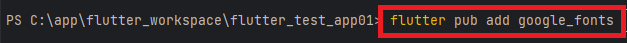 | > flutter pub add 패키지명 예) flutter pub add google_fonts ( 구글 폰트 사용) 명령어를 입력하고 나면 pubspec.yaml에 추가한 패키지가 추가되어 있음 |