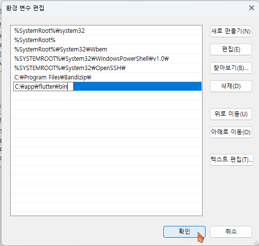 시스템 환경변수의 PATH에 위에서 압축푼 플러터 bin 경로(C:\app\flutter\bin)를 path에 추가합니다.
