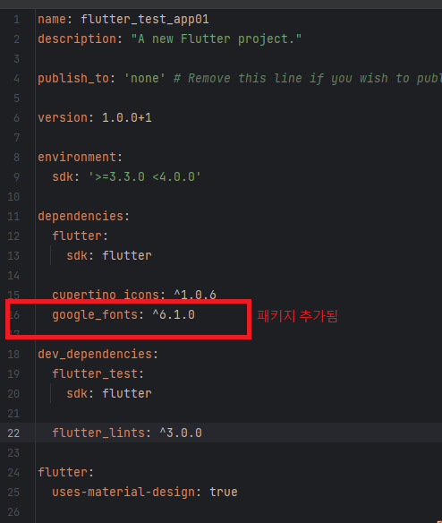 | > flutter pub add 패키지명 예) flutter pub add google_fonts ( 구글 폰트 사용) 명령어를 입력하고 나면 pubspec.yaml에 추가한 패키지가 추가되어 있음 |